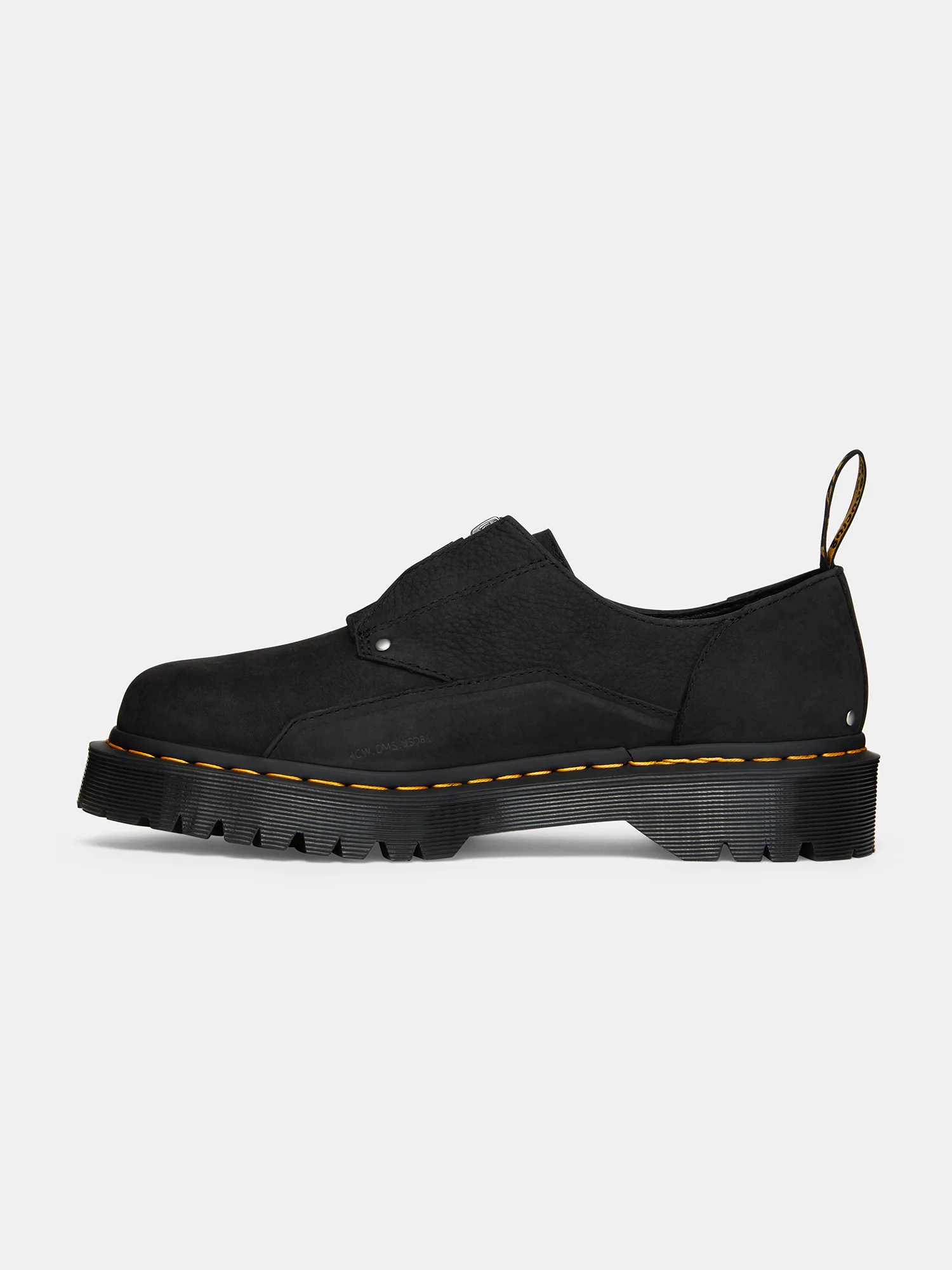 A utilitarian take on the Dr. Martens 1461 Gehry Shoe in Onyx featuring a robust sole unit, architectural paneling and a Silver foiled ACW* bracket logo.