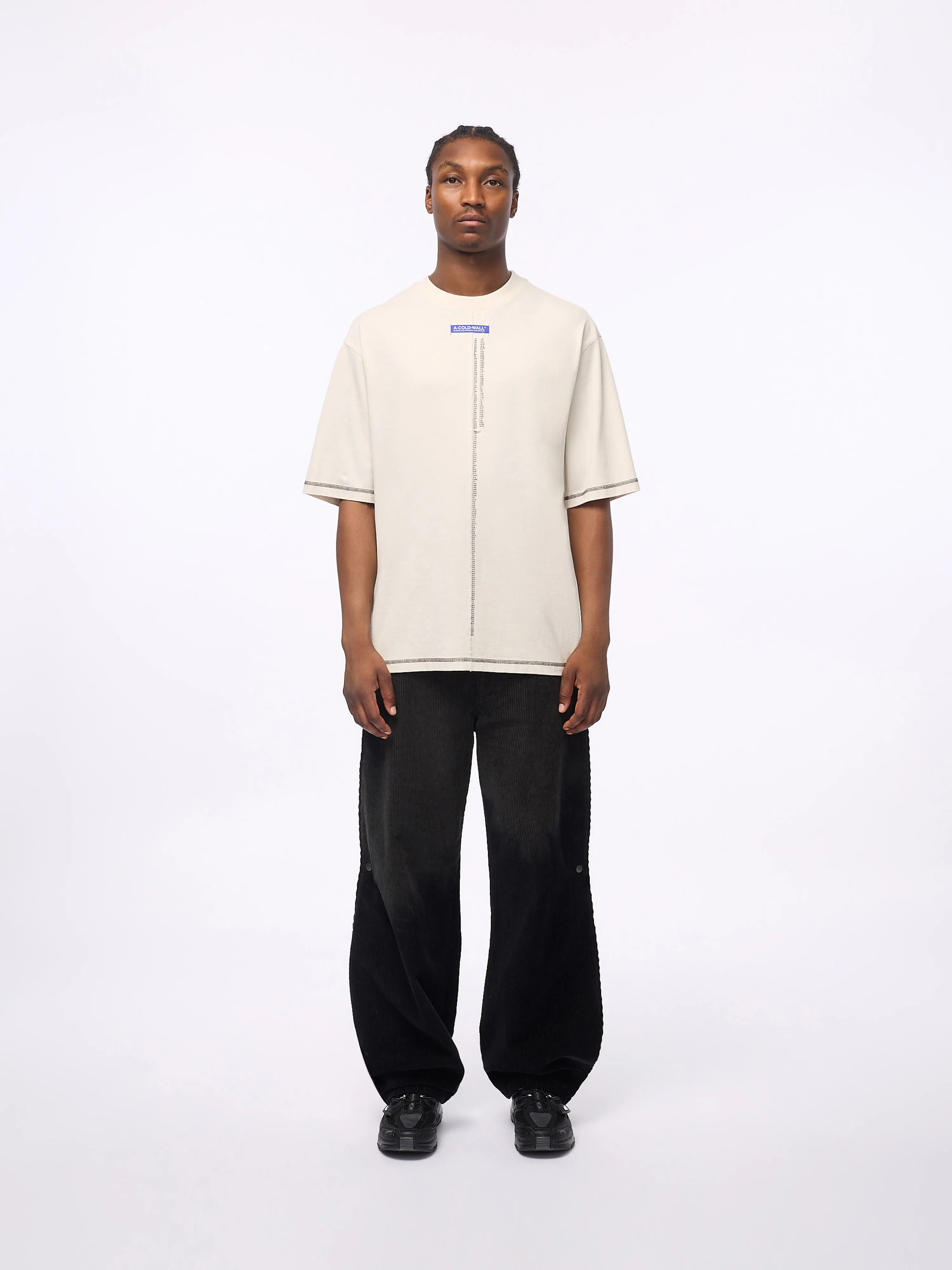 Relaxed-fit cotton T-shirt featuring a seasonal graphic and a raw edge cut and sew front seam.