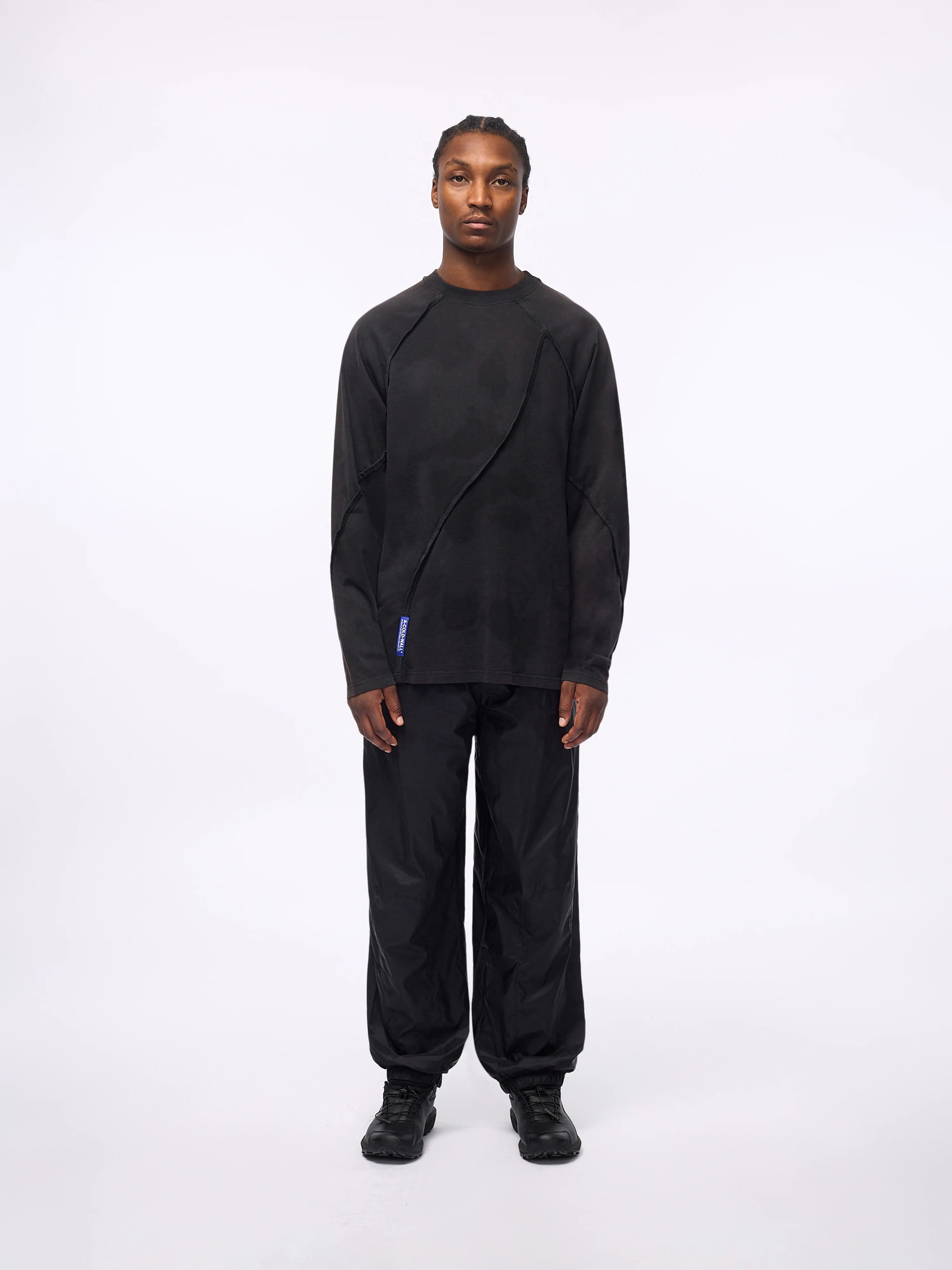 Relaxed-fit cotton T-shirt, featuring external contoured seams with bound edge finish. Garment dyed with tonal patina finish.