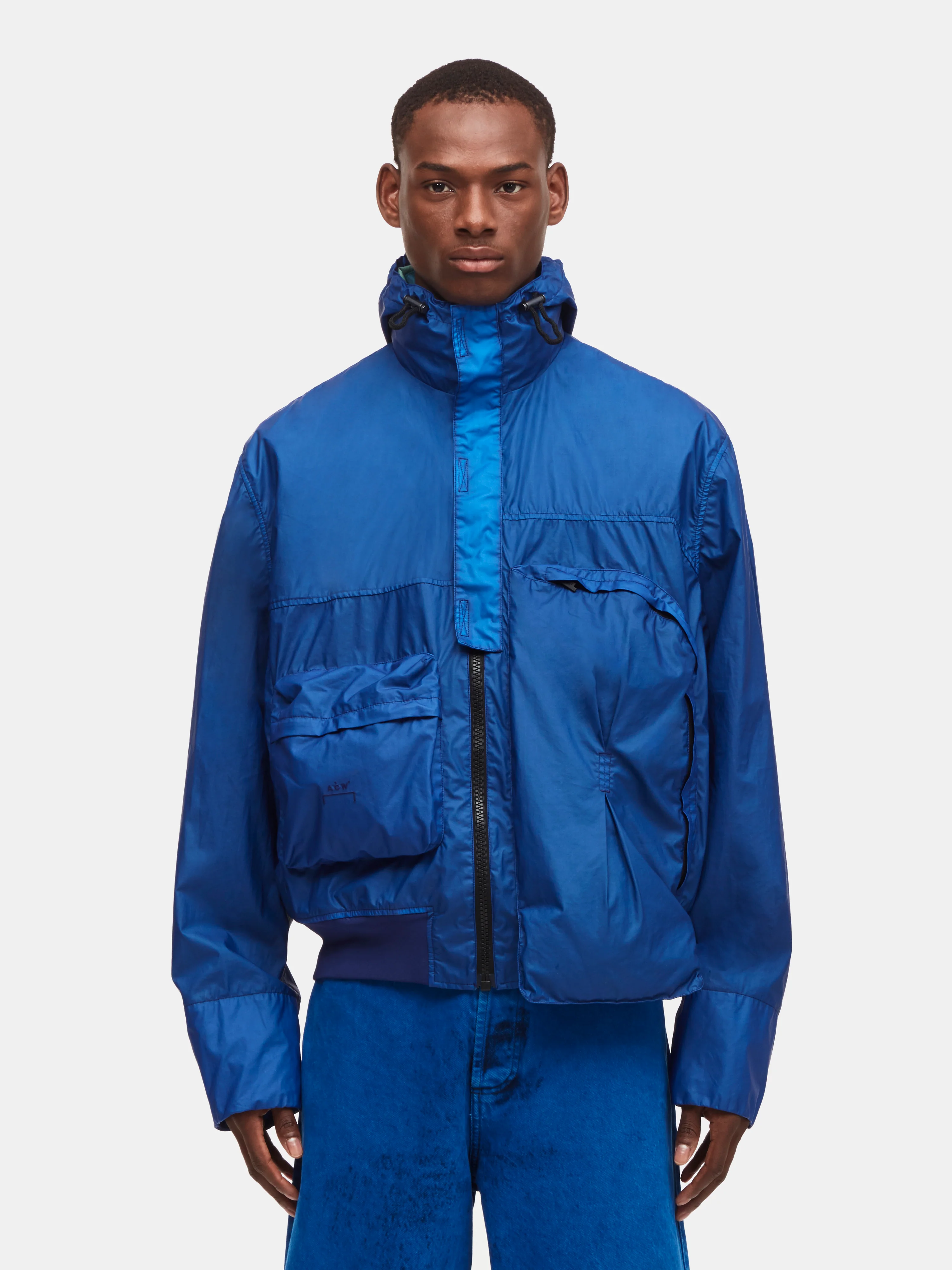 Asymmetry a returning theme for the season, this lightweight cotton poplin anorak features a single elongated 3D pocket, extending the front on one side. Garment dyed for a unique colour finish, each jacket unique, an adjustable drawcord hood and partial storm flap deliver coverage where needed.