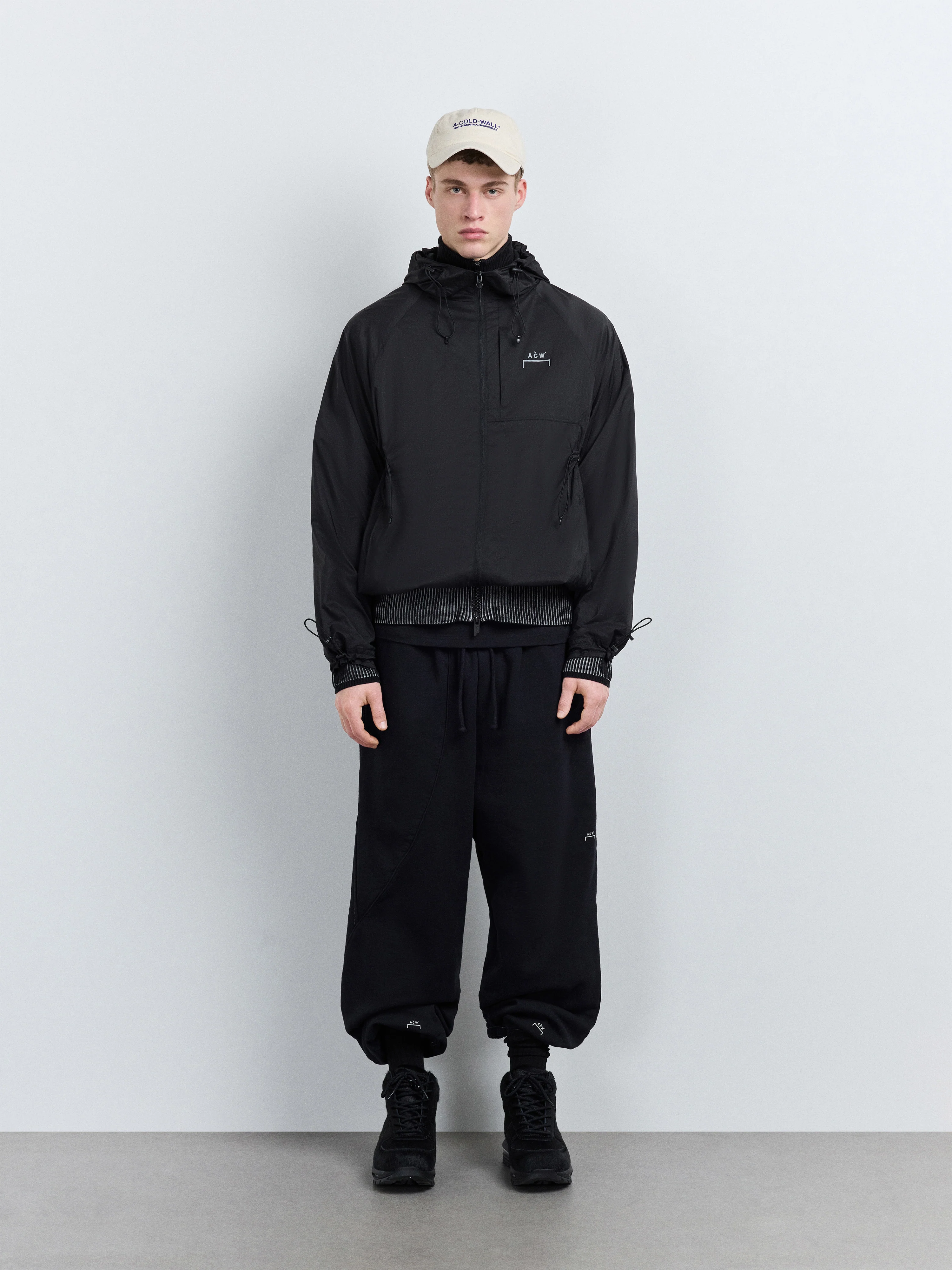 Relaxed-fit lightweight nylon windbreaker. Drawcord channels throughout allow the wearer to adjust the garment's shape and silhouette.