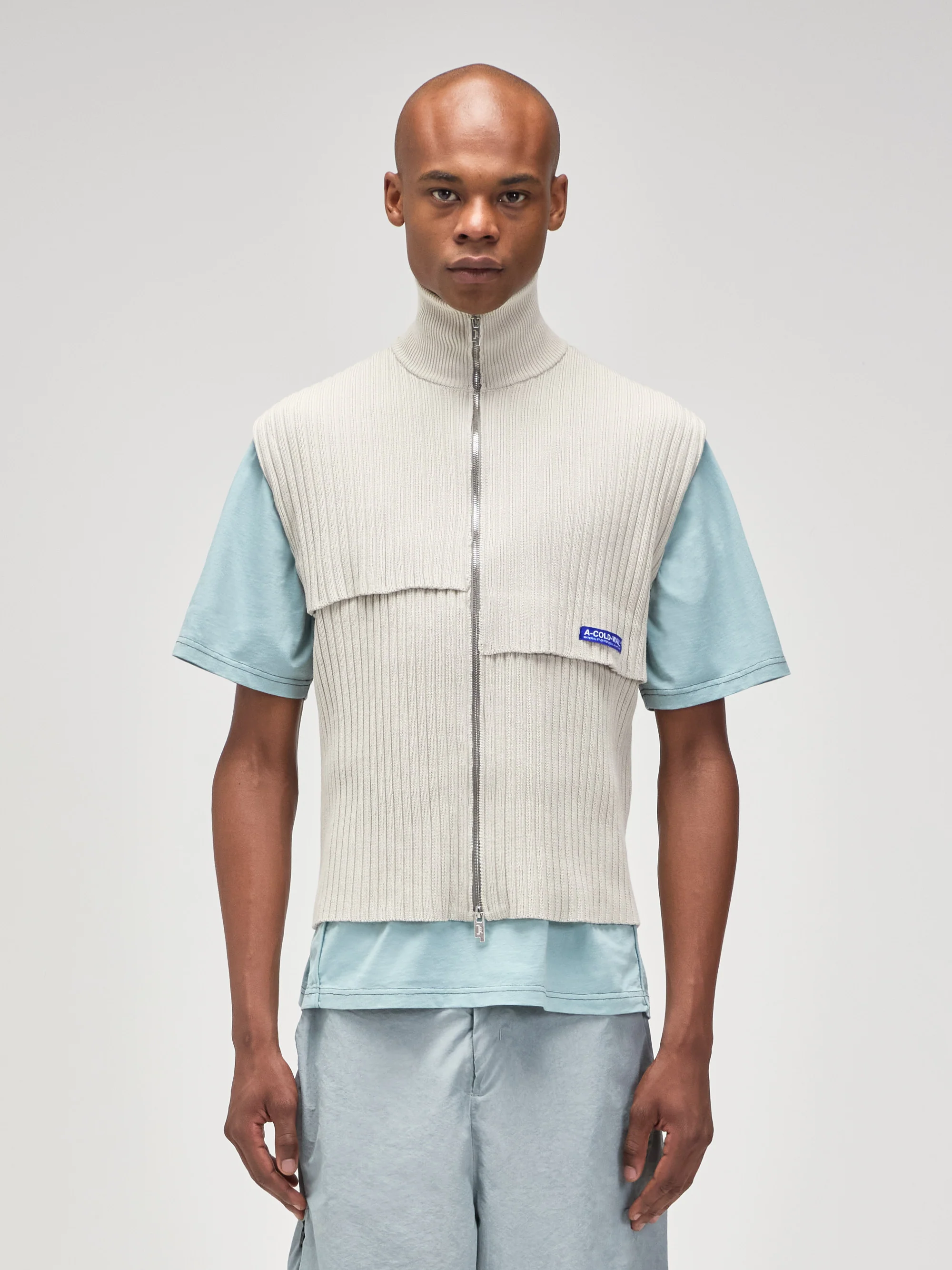 Regular-fit zip-through cotton knitted vest with a high neck, constructed from a series of overlapping asymmetric panels, secured at the seams.